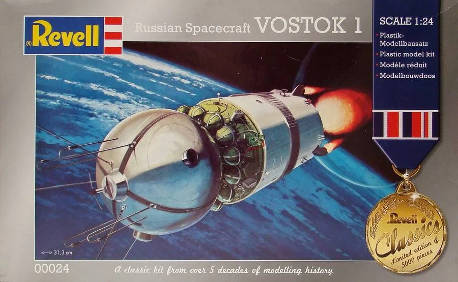 А вчера зашел я в магазин детских игрушек, хотел посмотреть подарок внуку на день рождения и обнаружил на полке коробку с моделью космического корабля "ВОСТОК 1" в масштабе 1:24 от фирмы REVELL. И как очень приятное дополнение к этому событию, на коробке висела табличка "-50%". Сразу воспомнилось о том , как я раньше клеил подобные модели КК " ВОСТОК" от "PLASTIKART"(ГДР) в М1:25 и КК "СОЮЗ" завода"ОГОНЕК"(Москва), на которых потом "полетали" мои еще маленькие дети, естественно с соответствующими для моделей последствиями. А здесь такой подарок прямо в канун праздника, да еще и за половину стоимости. Короче, вышел я из магазина с подарком и для внука , да и для себя "любимого". Потихоньку соберу модель , буду внукам с ее помощью рассказывать, откуда началась советская (да и мировая тоже) пилотируемая космонавтика. Модель упакована в красочную коробку с изображением выводимого на орбиту космического корабля, носовой обтекатель уже сброшен, но еще работает двигатель третьей ступени, разгоняя корабль до первой космической скорости, после чего должно произойти отделение КК от 3-ей ступени и он становится искусственным спутником Земли. Кстати, членение модели и байонетное крепление ее составных частей позволяет демонстрировать эти фазы полета. Детали отлиты на трех рамках серо-серебристого пластика и одной рамке из прозрачного пластика, без облоя и видимых утяжин, для оформления приборной доски дана небольшая декаль. Внутри спускаемого аппарата имеется катапультное кресло и фигурка космонавта в полном облачении. Сплошная ностальгия. Начну собирать модель, возможно дополню что-то из интерьера. ПОЕХАЛИ...
