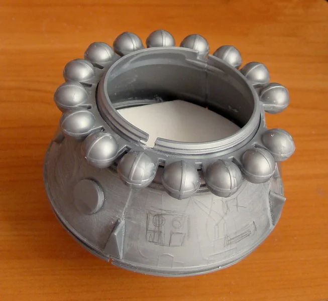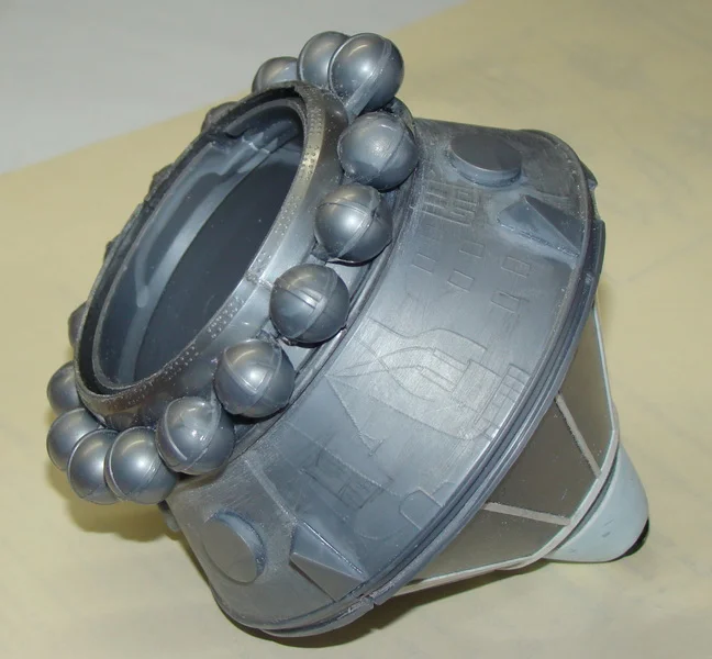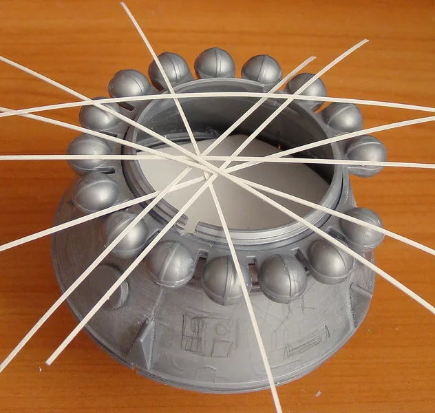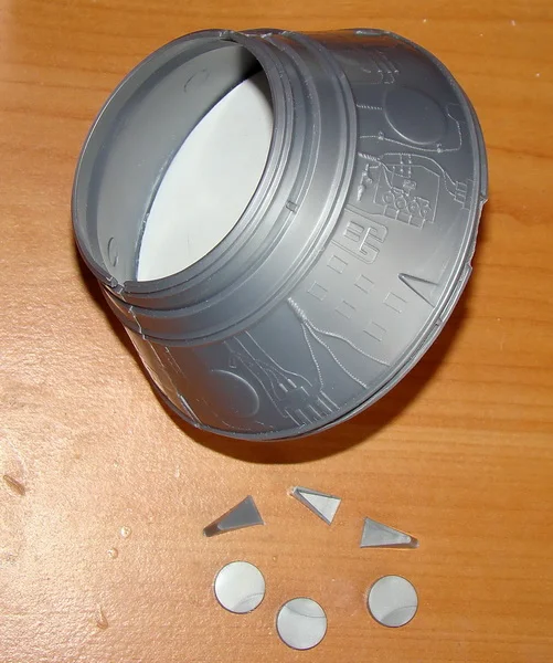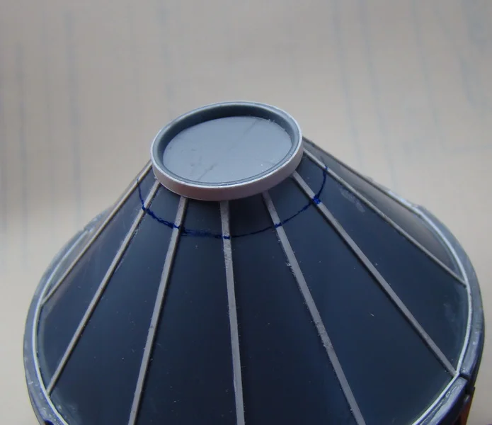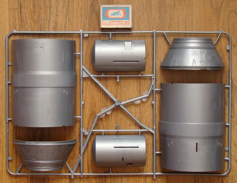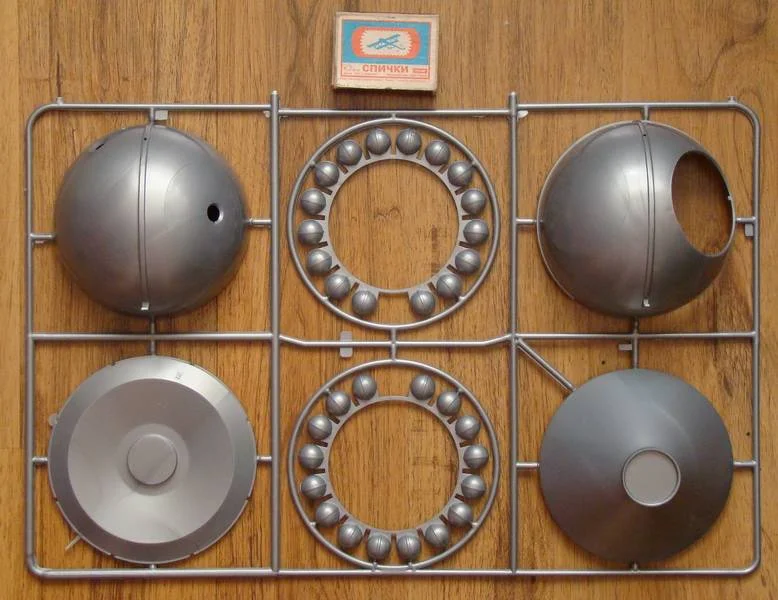 Продолжаю работу над приборным отсеком.Работа пошла интереснее, когда мой приятель моделист, узнав , что я занялся сборкой "Востока", принес целый пакет с остатками Пластикартовского и Огоньковского Востоков. Корабль от "Огонька" еще сохраняет какой-то вид собранного изделия, да и масштаб у него поменьше, всего 1:30. Отложу его в сторону, как -нибудь, в свободное время доведу до ума . А вот останки Пластикартовского корабля запущу в дело и произведу объединение двух моделей в одну. При общей внешней схожести моделей это совершенно разные отливки, с разными масштабами и разным членением и содержанием комплектующих деталей. Пластикартовский Восток выполнен более содержательно и более точно, чем его Ревелловский собрат. Буду брать недостающие детали из кучи остатков Пластикарта, пилить, шлифовать , подгонять на собираемую модель, тем самым доводя ее до схожести с реальным космическим аппаратом.Шаровые баллоны высокого давления (до 300атм) , заполняются азотом для работы двигателей ориентации корабля во время орбитального полета и воздухом, для обеспечения жизнедеятельности космонавта. В наборе данные баллоны выполнены двумя отливками, при склеивании образуют кольцевую раму с прикрепленными к ней баллонами. Склеив заготовки, примерил их на приборный отсек. При этом выявилось, что видно место сопряжения спускаемого аппарата и приборного отсека. На модели Пластикарта это место сопряжения закрыто кольцом, а баллоны опираются на кольцевой силовой шпангоут, отсутствующий на модели Ревелл. Взяв детали от Пластикартовского набора я вырезал из них это кольцо и силовой шпангоут. Кольцо приклеил к кольцевой раме с баллонами, а силовой шпангоут -к корпусу приборного отсека, предварительно подогнав их по размеру прошкуриванием. Нижнюю конусную часть приборного отсека закрывают створчатые жалюзи системы терморегулирования. Из картона изготовил шаблон одного сектора жалюзи, а затем при помощи клея и нарезанной из листового пластика "лапши" произвел секторное оформление нижней части приборного отсека. В дальнейшем в данные сектора будут вклеены створки системы терморегулирования.