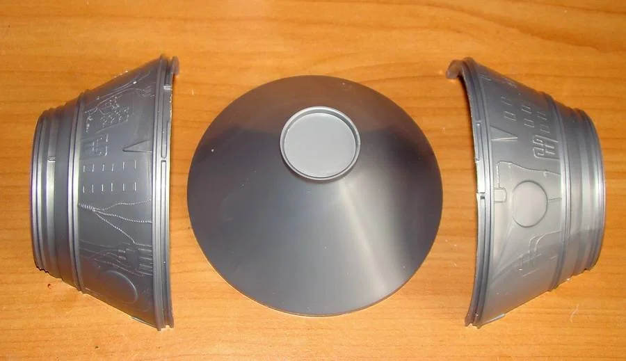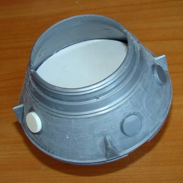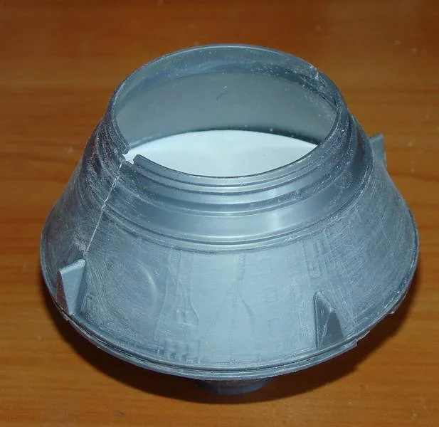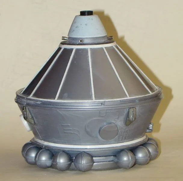 Поэтому работу начинаю с приборного отсека. Вечер посвятил сбору информации и фото из интернета и затем стал сравнивать творение "РЕВЕЛЛ" с действительностью. Оказалось, что элементы обвязки приборного отсека, расположенные на верхней конусной поверхности совершенно не соответствуют реальности, а посему им дорога под "шкурник", а затем придется изготовить их заново в объеме из подсобных материалов и оплести разводкой из проволоки. Недосчитался я еще одного кожуха, прикрывающего элементы электроразводки- придется делать дополнение к набору.Соответственно, необходимо будет изготовить жалюзи системы терморегулирования , тормозную двигательную установку и еще чего-нибудь, по мелочи. Вычленив из рамки детали приборного отсека, приступил к их склейке. Для удобства склейки две сопрягаемые детали верхнего конуса снабжены фиксирующими бобышками и ответными местами под них. Промазав клеем торцы деталей, соединил их и для фиксации стянул резинкой. Для большей жесткости внутрь конуса вклеил заранее вырезанный пластиковый диск. Затем к верхнему конусу приклеил нижний конус, отлитый одной деталью. После сушки шкурником удалил с поверхности верхнего конуса все выпуклые элементы обвязки, вычленил из рамки накладные детали четырех обтекателей и трех кожухов, прикрывающих платы для электроразводки. Четвертый, недостающий, кожух изготовил из листового пластика. После этого приклеил данные элементы на приборный отсек в соответствии с фотографиями реального КК.