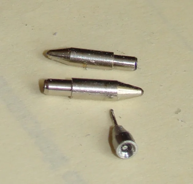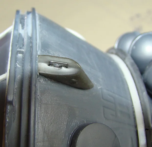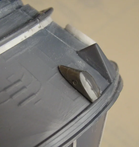 На клеевой шов между корпусом и кольцом силового шпангоута снизу приклеил кольцевую накладку , выполненную из ленточки листового пластика толщиной 0,3мм. На верхний конус приклеил корпус механизма выпуска ленточных антенн системы двухсторонней радио - телефонной связи космонавта с Землей, взятую из останков "Пластикартовского "набора (у "Ревелла" данная деталь в набор не входит). Неверно сделаны на модели "Ревелла" и обтекатели антенн системы телеметрического контроля орбиты (4 штуки). "Пластикартовские" детали выглядят более реалистично, их я и приклеил на корпус приборного отсека ( предварительно срезав приклеенные ранее обтекатели от "Ревелл") , а затем немного их доработал - бором выбрал в торцах круглые углубления и изготовил из проволоки элементы антенного устройства. Сопла двигателей система ориентации, расположенных в хвостовой части корабля, на цилиндрическом кольце кожуха тормозного двигателя, изготовил их пишущих узлов от стержней для шариковой ручки, обрезав их в размер и удалив шарики. На кольце сопла установил при помощи проволочных штифтов.