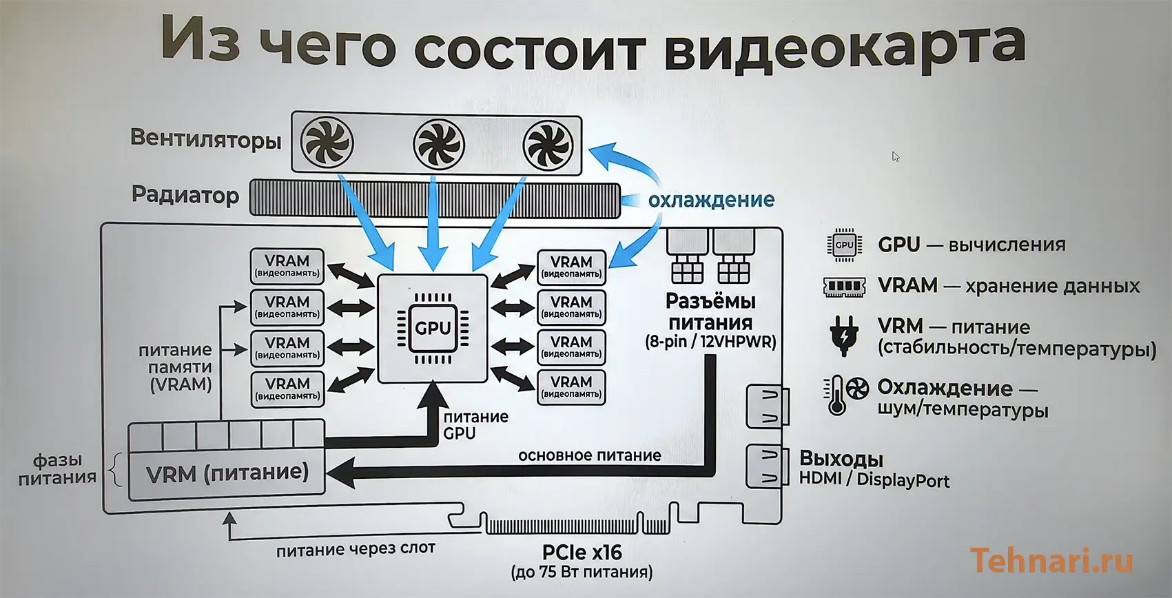 ИнструкцияИз чего состоит видеокарта: GPU, VRAM, питание, охлаждение