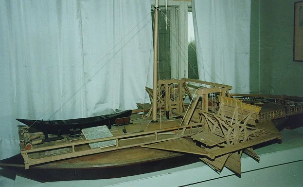 Второй водоход Кулибина имел четыре водных колеса, проект третьего водохода предусматривал наличие только двух колёс.