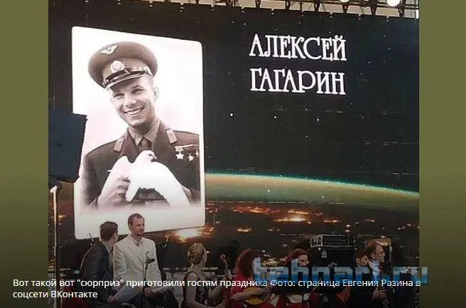 Не стал исключением и сегодняшний день, когда несколько тысяч самарцев сделали для себя совершенно неожиданное открытие. Первого космонавта планеты Земля, человека из легенды, оказывается, звали Алексей Гагарин, но никак не Юрий. Об этом гласила соответствующая заставка на экране за главной сценой, установленной на набережной. Рядом с фото прославленного покорителя космоса (ладно, хоть с портретом не напутали) красовалась надпись «Алексей Гагарин». Естественно, такой казус не мог не оказаться в объективах многочисленных мобильных камер.