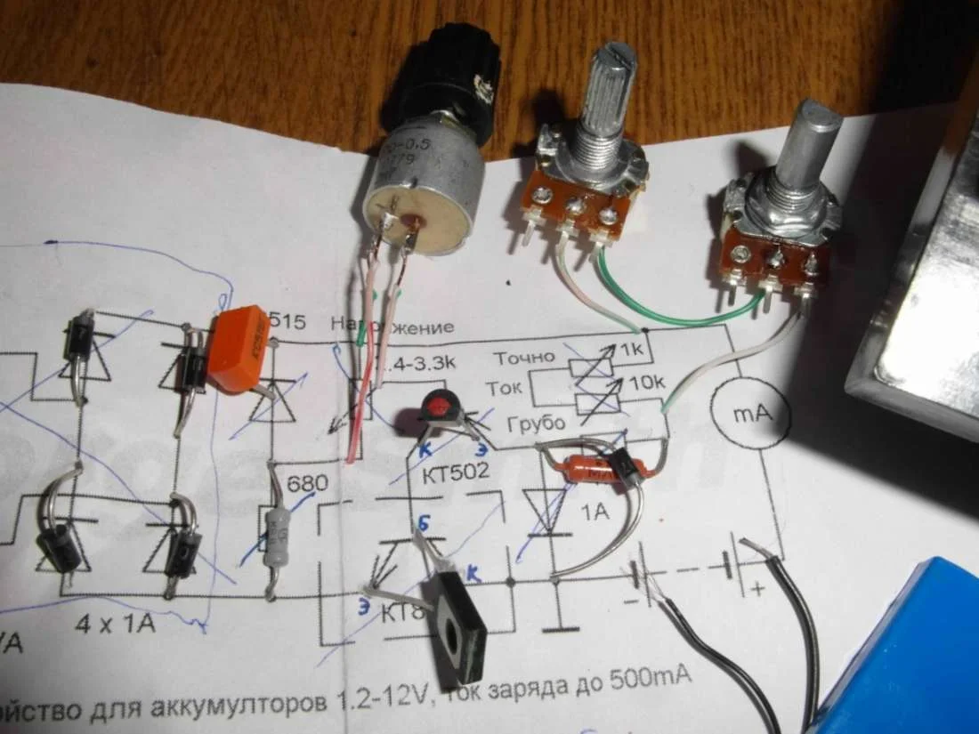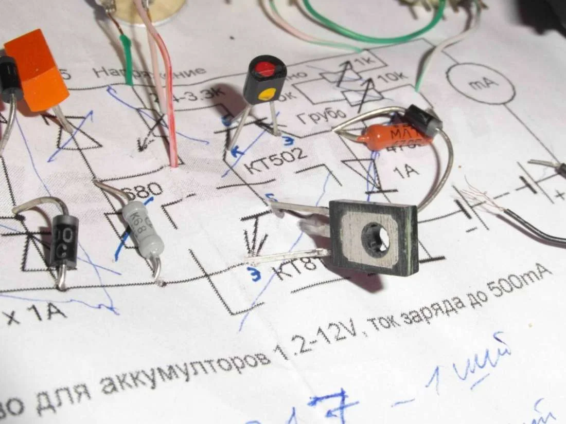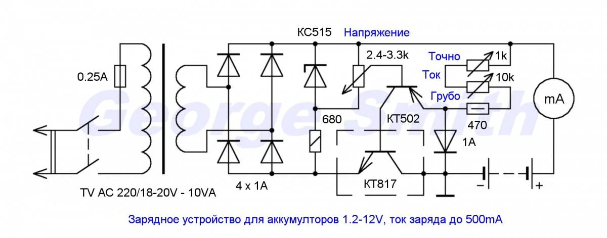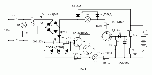 Схема проста в изготовлении и не содержит дефицитных деталей при возможности наличия современных комплектующих диодов, тиристоров и транзисторов ее можно применить на более большие токи зарядки. При недостаточной поверхности для охлаждения транзисторов Т2 и Т3 и тиристора Т1 из-за малой поверхности радиаторов необходимо установить дополнительный вентилятор для охлаждения поверхности радиаторов.