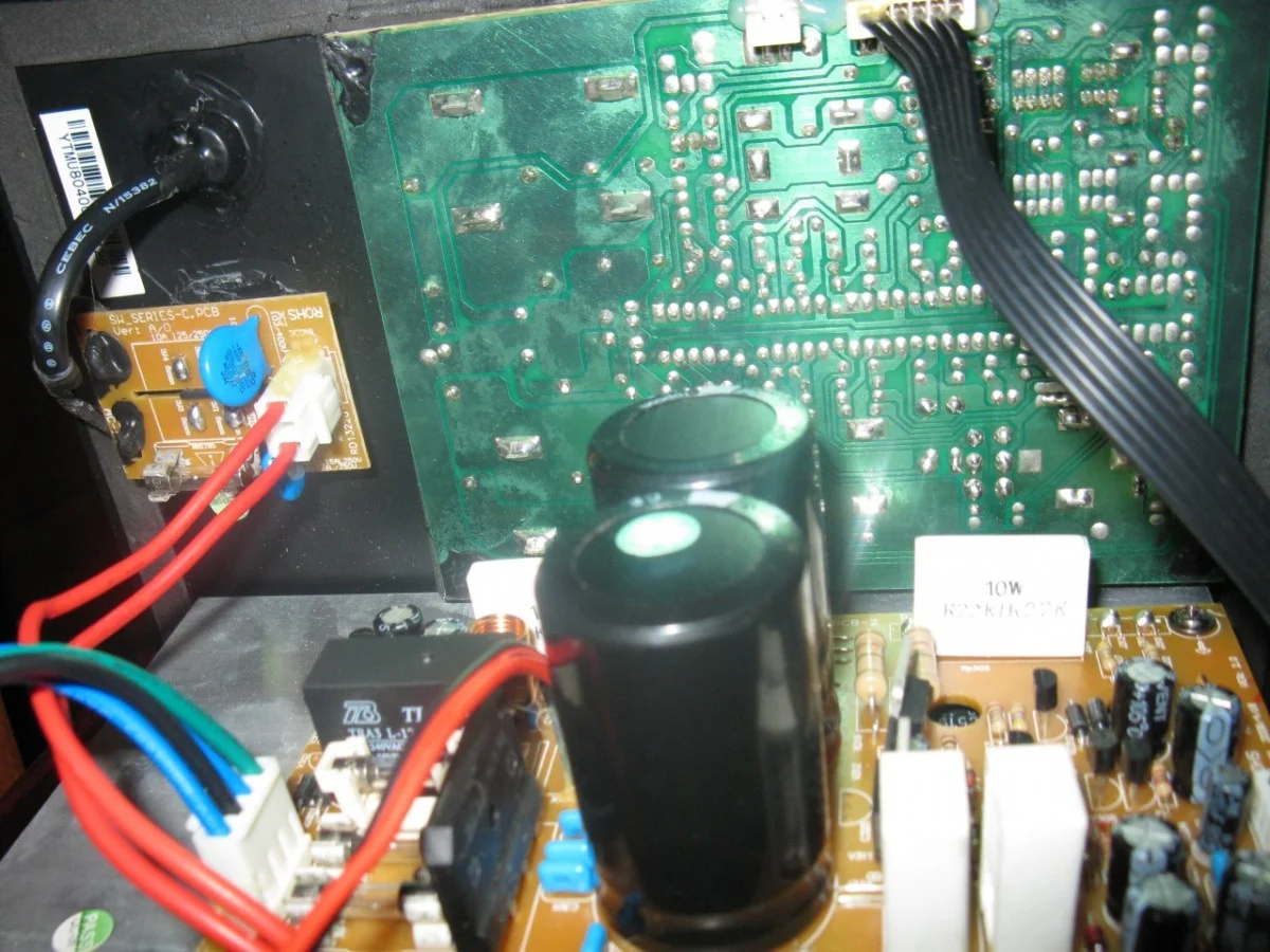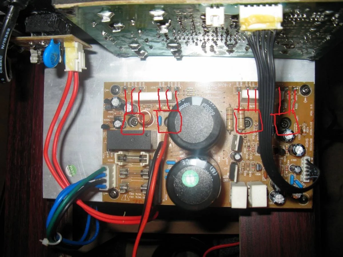Да я тоже так же думаю, их спалить это надо по стараться. Быстрее микроб сгорит чем они. Я грешу на электролит (тот что с наклейкой) хотя надо бы еще и на микроб посмотреть. Тут судя по мощности(140w) 7293 либо аналог её.Эти 2 белые штучки это керамические резисторы высокой мощности, чтобы он сгорели их нужно очень сильно нагреть.