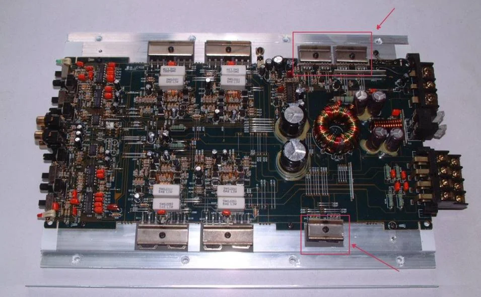 Что-то я ничего не понимаю... либо схема не на тот УМ либо это китай-сборка, по схеме в БП Q7,Q8,Q9,Q10 стоят мосфеты IRZF44, на плате же какая то неразбериха...