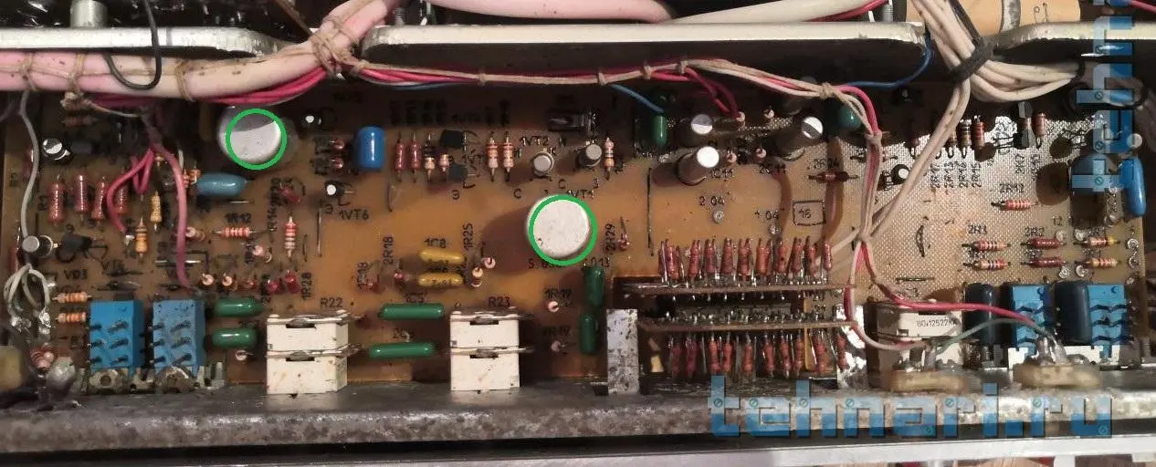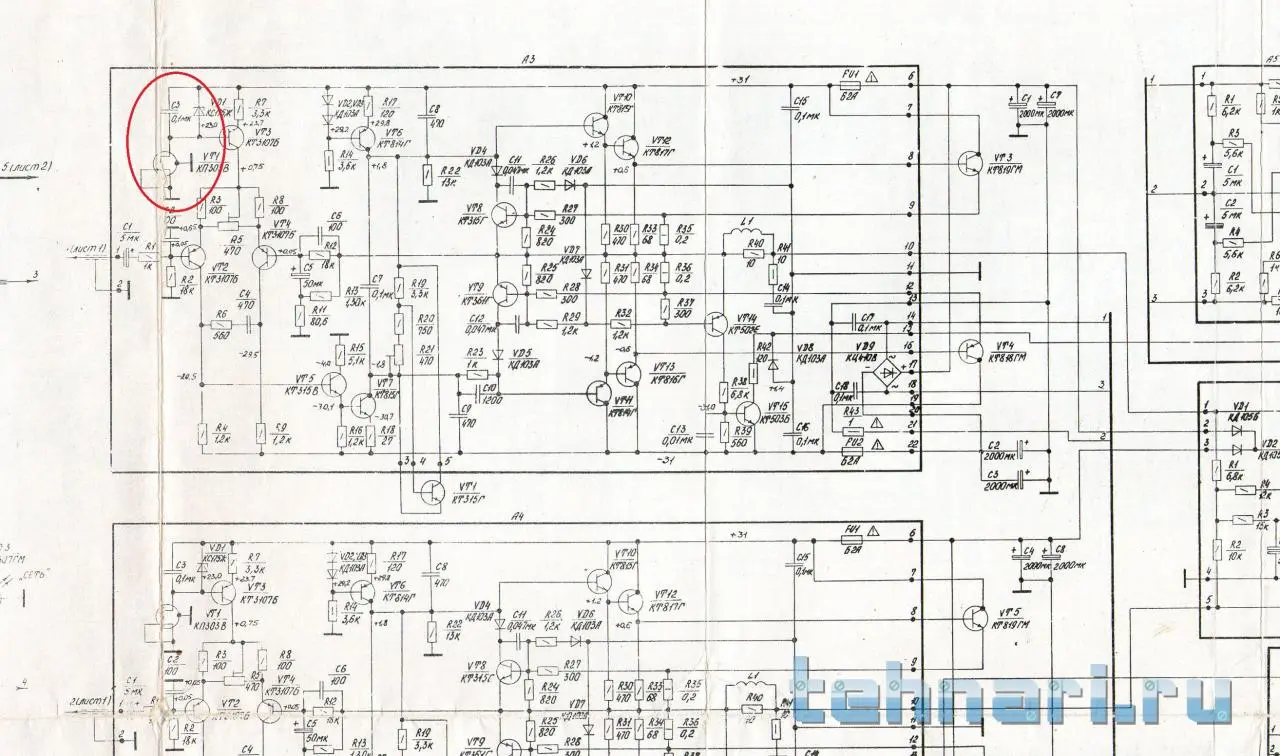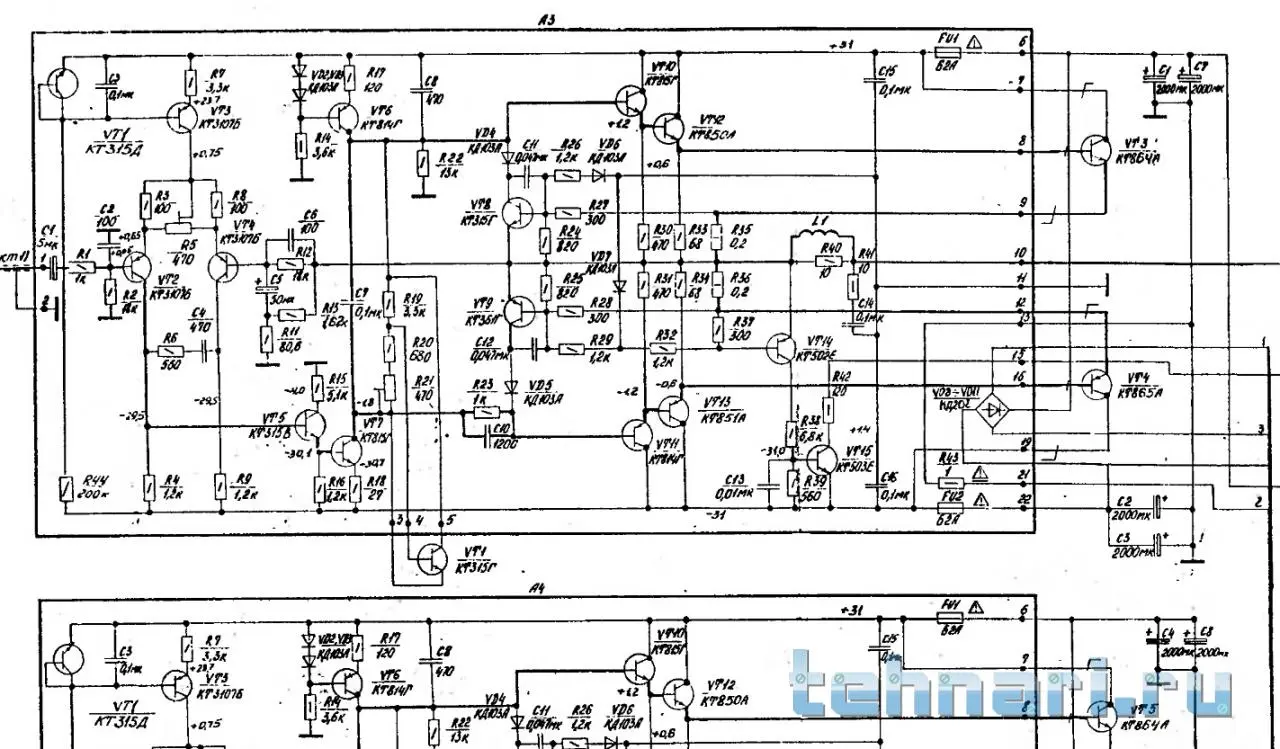 Заходите на форуме помогут. Да, всё таки хотелось бы увидеть марку транзисторов выхода, те которые стоят на радиаторе. Пластмассовые крышки на винтиках, сами транзисторы снимать/выпаивать для этого не нужно. Просто мне известно три модификации этого усилителя, различаются выходными усилителями (УМ), ну и соответственно нумерация элементов на печатных платах будет отличатся. В предварительных тоже. (предварительные одинаковые).