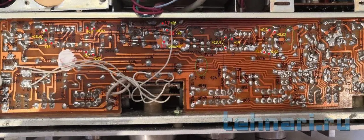 Вроде наметил. Разбираться по фото - ещё то "занятие". Замеры производить относительно "общего" провода (точки - обозначил), можно относительно "шасси" (корпус усилителя). У ,Вас, мультиметр - ставте предел измерения постоянного напряжения, "чёрный" на корпус ("общий"), "красный" - на плату (измерять). Полярность мультиметр должен выбрать сам.