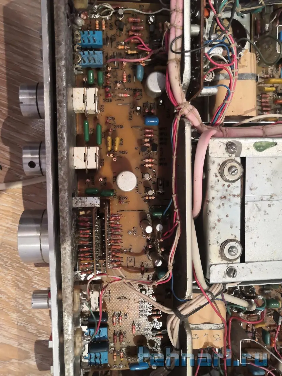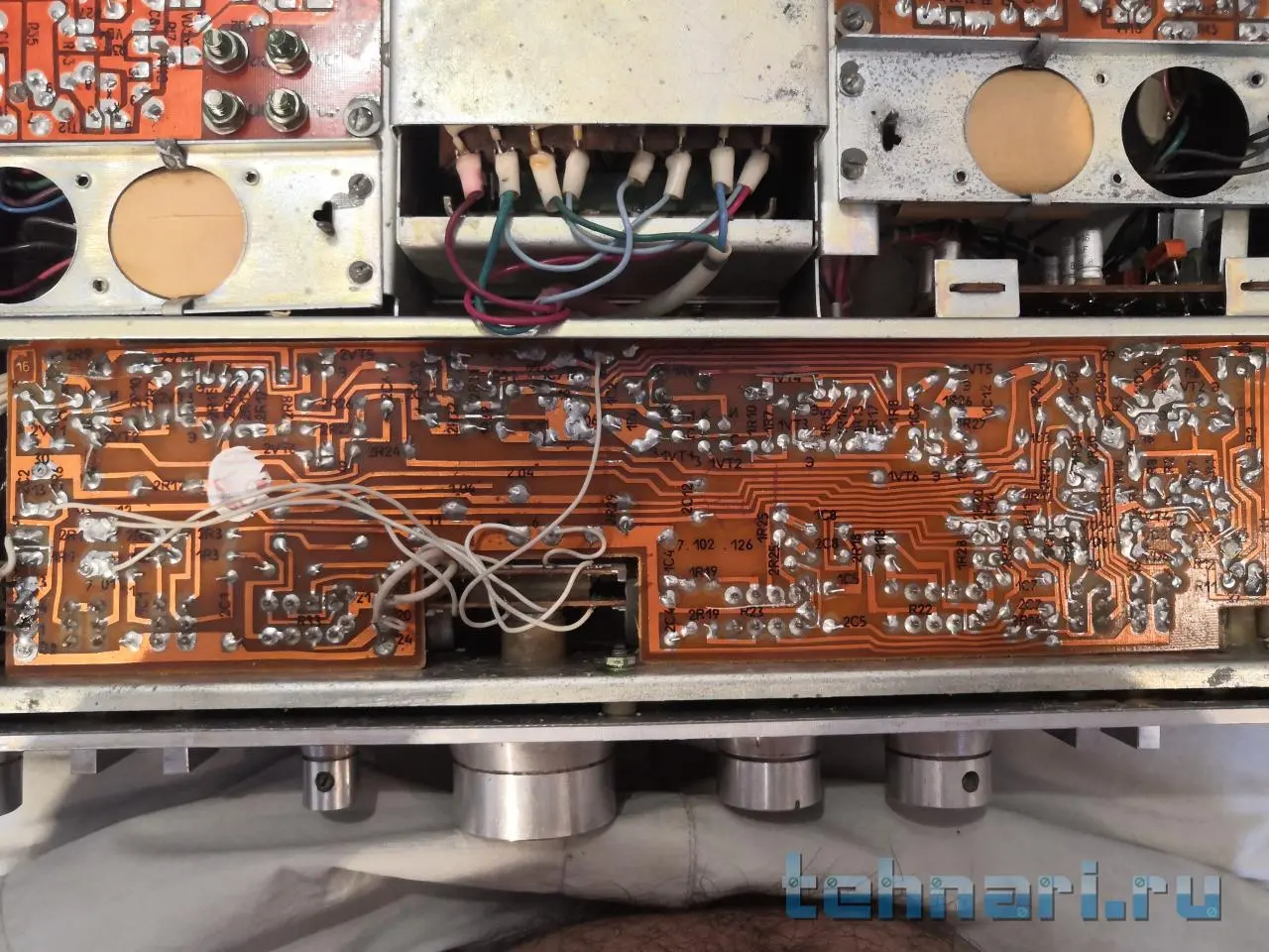 В оконечном лазить не надо. Платки с транзисторами над выходными транзисторами (каламбур))) ) прикрутите назад , только не переусердствуйте. Можете? сделать фото платы предварительного с обеих сторон, так будет проще.