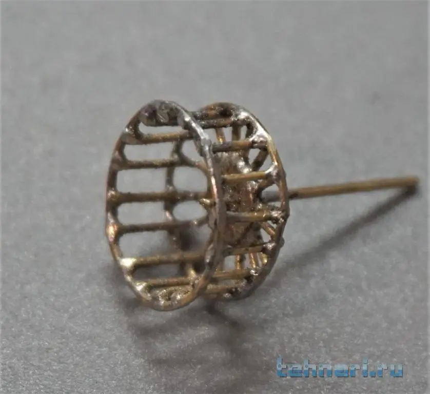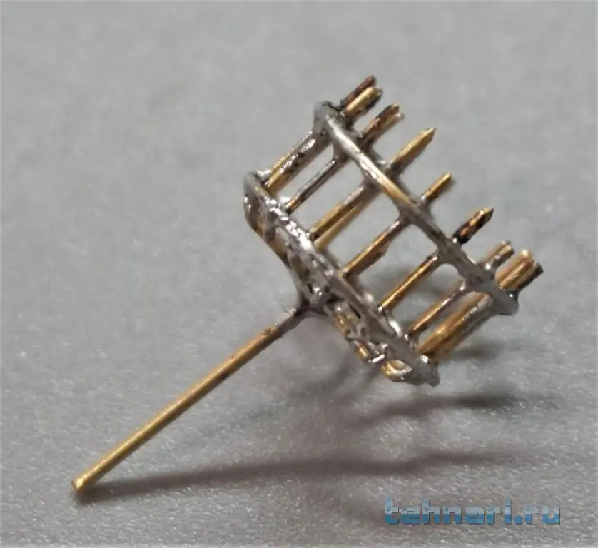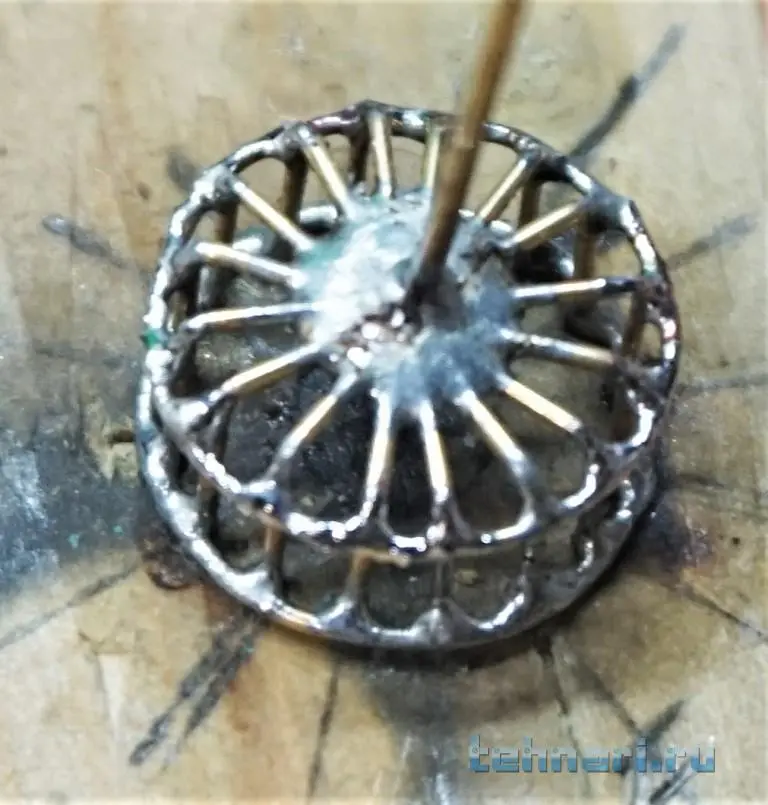 На этот раз в ход пошла латунная трубка Ф0,7мм. На простейшем кондукторе были разложены составляющие элементы конструкции, а затем спаяны. В заключение операции на полученного "ежа" было припаяна пара замыкающих колец, лишние концы "колючек" обрезаны и зачищены.