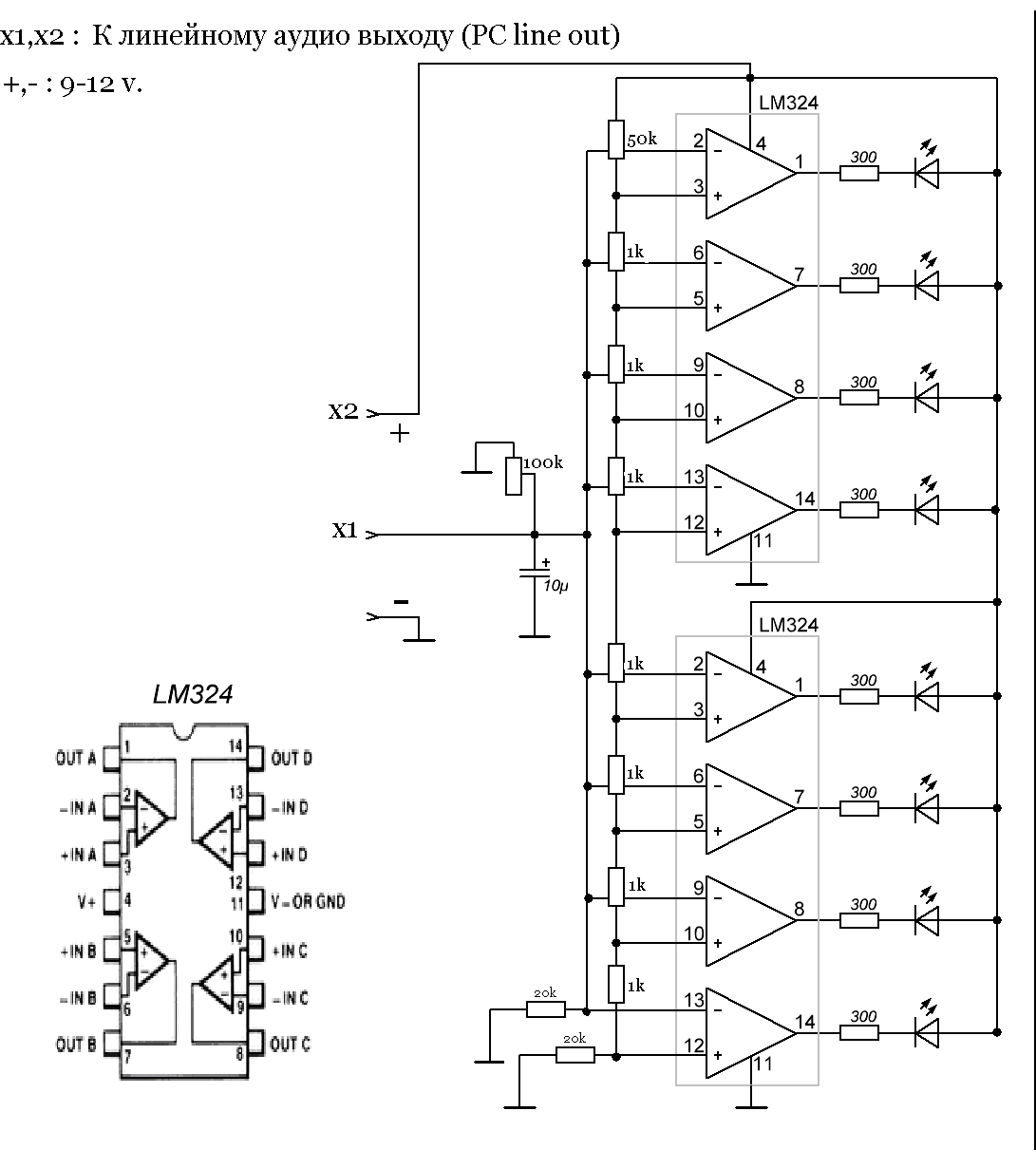 Нашёл схему светодиодного эквалайзера на 8 светодиодах.Кто может подсказать можно ли увеличить количество светодиодов до 12 добавив в схему ещё одну микросхему LM324? И что для этого надо сделать
