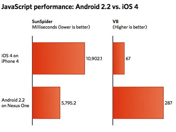 Противостояние самых перспективных операционных систем для современных сотовых телефонов быстро нарастает — пресса активно подливает масла в огонь. Так, популярный технический ресурс Ars Technica сравнил производительность встроенных браузеров Apple iOS4 (iPhone 4) и Google Android 2.2 (Nexus One) при обработке нагруженных программ на языке JavaScript. Замер скорости производился при помощи бенчмарков SunSpider и V8.