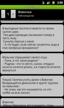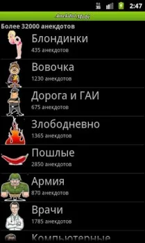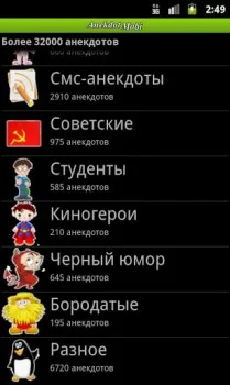 В приложении все анекдоты разделены на категории для более удобного поиска шуток подходящих по духу и и настроению. Всего в коллекции более 32.000 анекдотов, которые можно отправить по СМС или на электронную почту. Ничего лишнего вам остается только запустить программу, выбрать жанр и наслаждаться чтением.