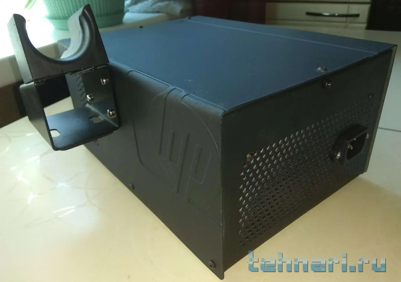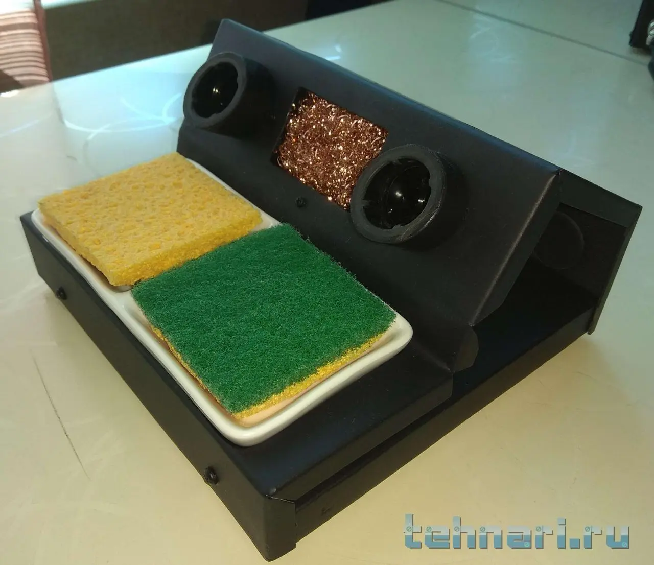 Решил сделать и новую подставку под два паяльника. Как уже писал, слесарь и жестянщик из меня тот ещё. Ну, как получилось - так и получилось (на это творчество ушёл почти целый корпус от системного блока). Паяльники входят легко и держатся надёжно. Основание, для утяжеления, сразу сделал из ЛДСП, теперь стоит надёжно. Ванночек из нержавейки нигде не смог найти, пришлось использовать керамику. В крайнем случае, когда их найду, то ничего не стоит сделать сверху металлическую накладку с нужными по размеру отверстиями.