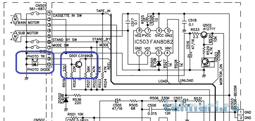Чтобы обойти ЛПМ, надо на базу транзистора Q501 (C3199GR) подать импульсы, т.е. периодически замыкать её (базу) на массу (корпус). Эту функцию, когда присутствует кассета, выполняет фотодатчик с фотодиодом, которые расположены под подкассетником на ЛПМ (см. вторую схему). Импульсы можно организовать с помощью мультивибратора, собранного либо на транзисторах, либо на логике.