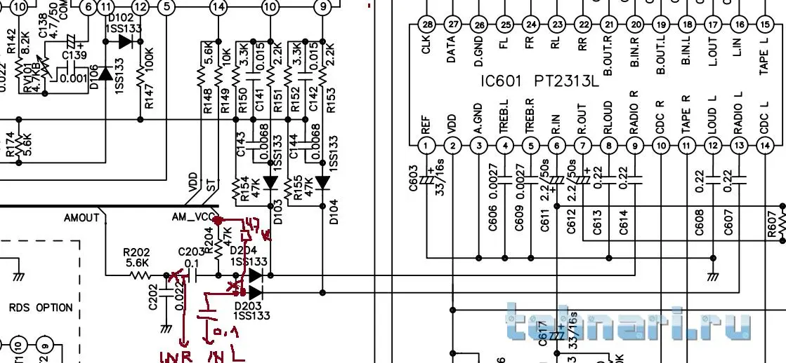 предварительно обойдя предусилитель, удалив конденсаторы (см. рис. обведено красным)