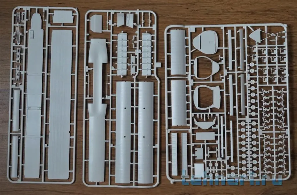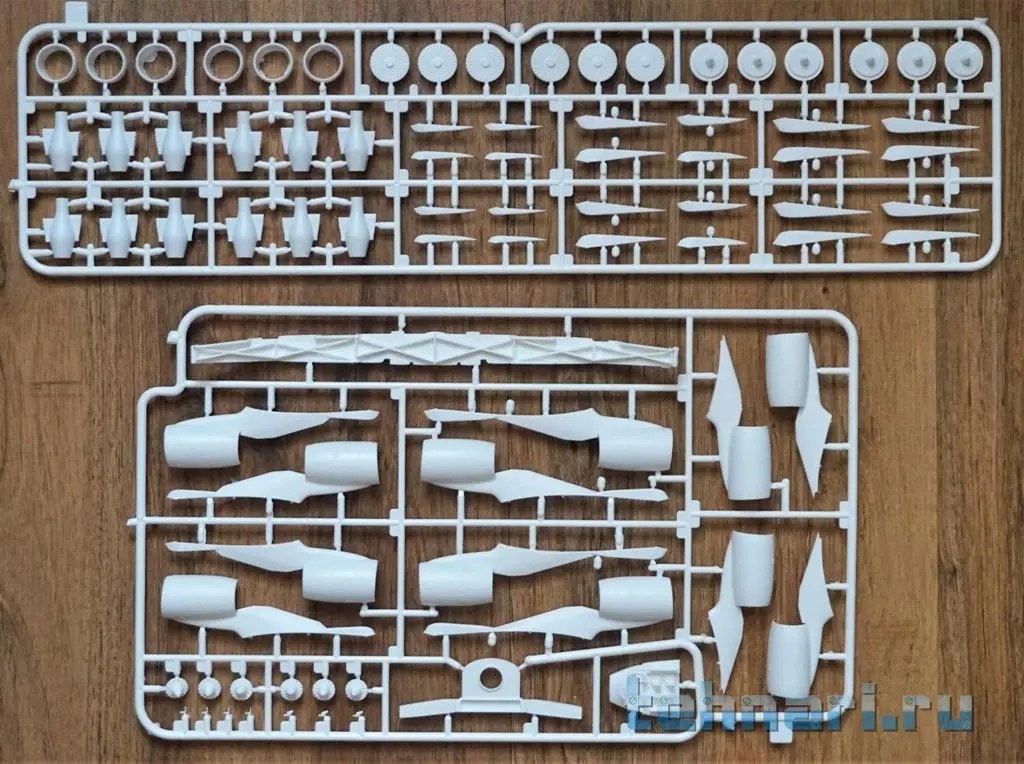При членении деталей крыла и центроплана модели Ан-225 фирмой предложена вот такая конфигурация, при которой верхняя часть есть центроплан в чистом виде + приставные плоскости крыла, а нижняя часть является единым соединением части центроплана с плоскостью крыла. Такое членение позволяет жестко скрепить (склеить) верхнюю и нижнюю половины центроплана и крыла с фюзеляжем. Но после такой склейки модель не входит на полку в шкафу, да и перевозить ее на слеты-выставки становится проблематично из-за размеров коробки.