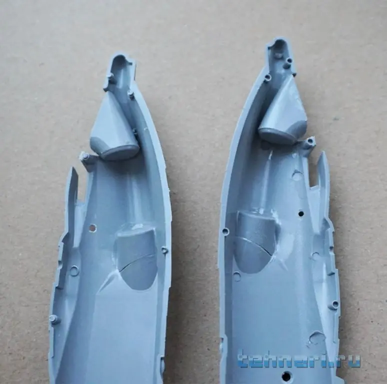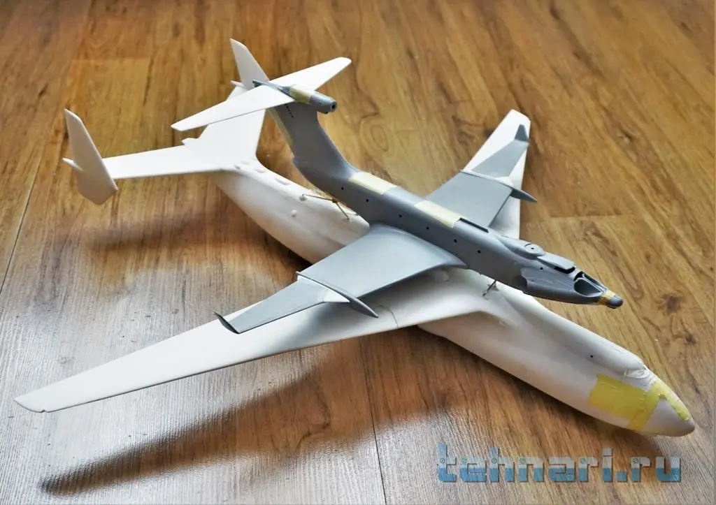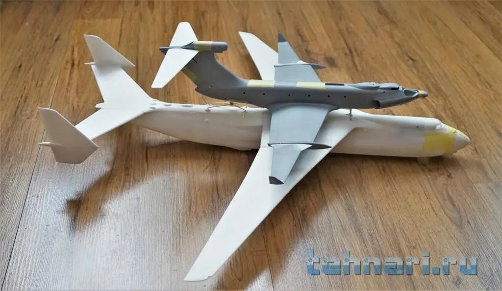 В коробке находится модель транспортно-десантного экраноплана, на котором выгрузка боевой техники (бронетранспортеров) и десантников производится через откидывающуюся в сторону головную часть фюзеляжа. Поскольку данная функция на "Спасателе" не нужна и фюзеляж не имеет подобных ворот, то срезаем с корпуса элементы шарнирного и замкового устройства откидной части фюзеляжа.