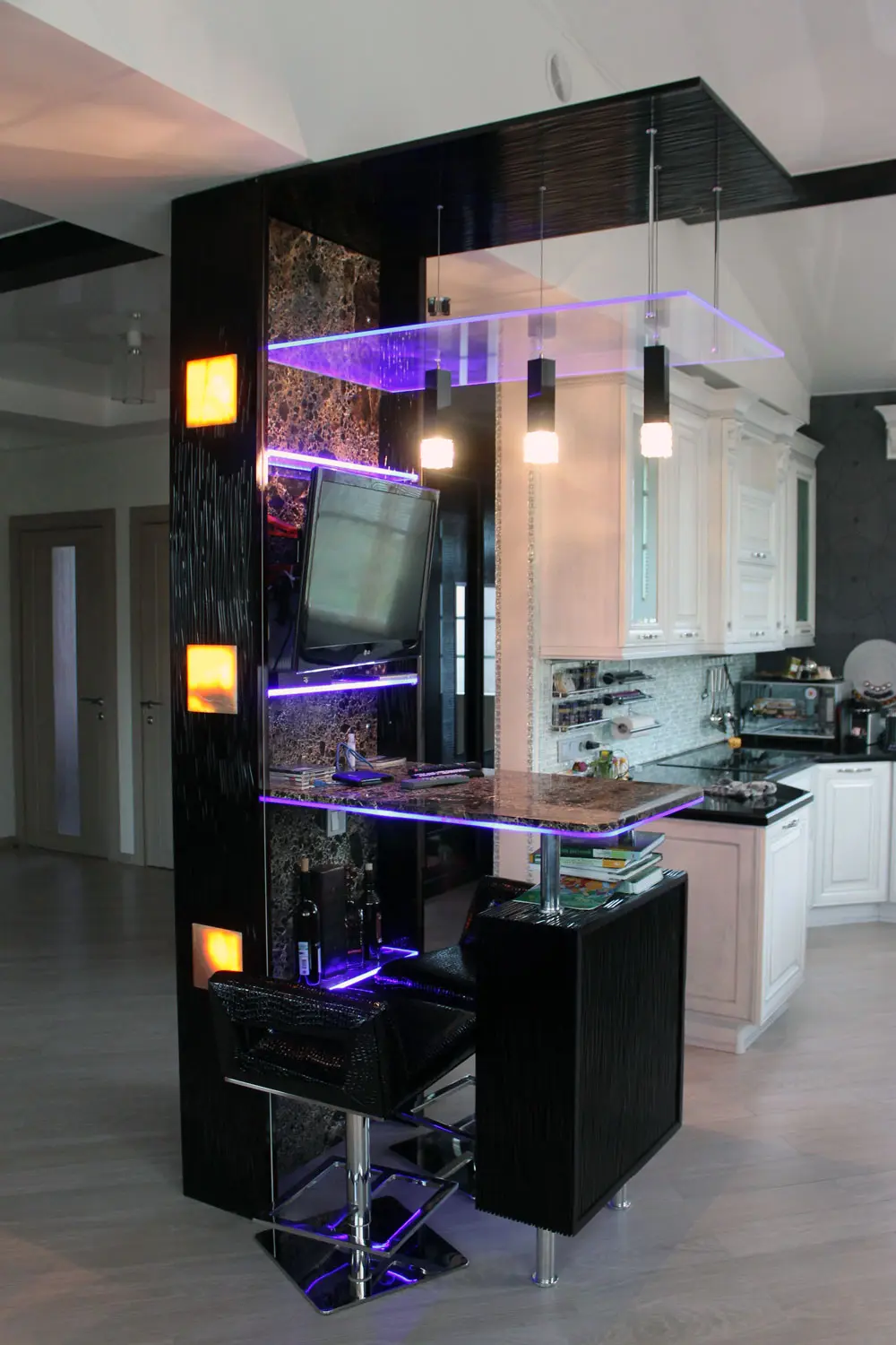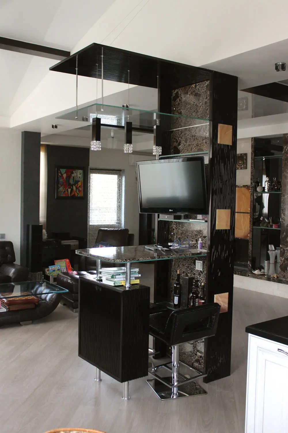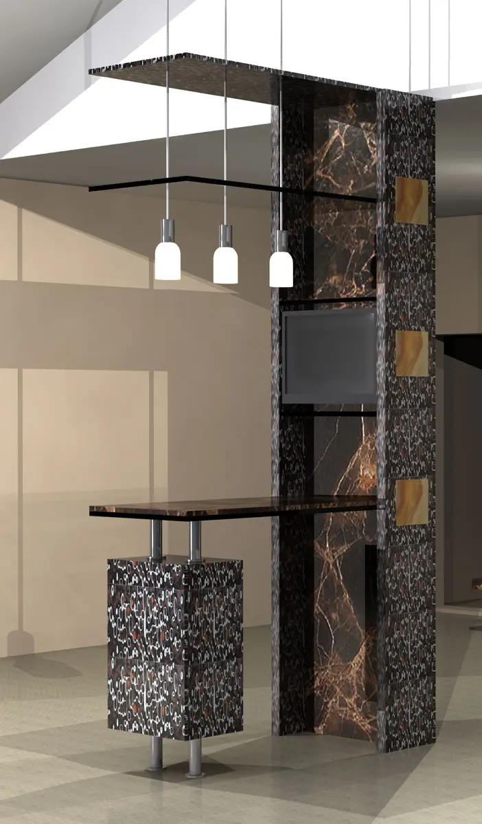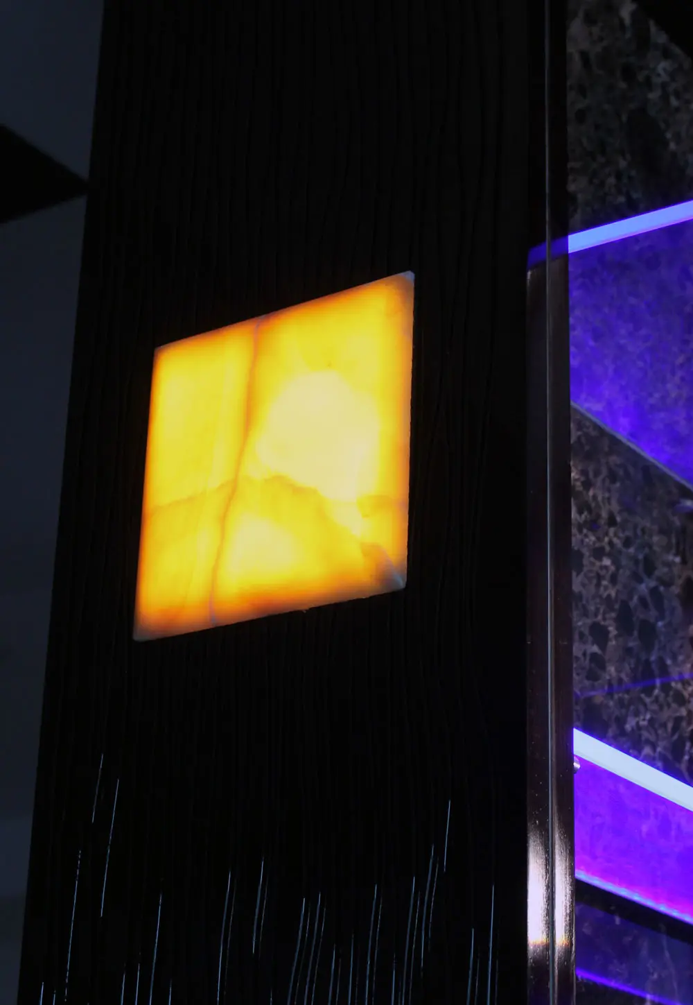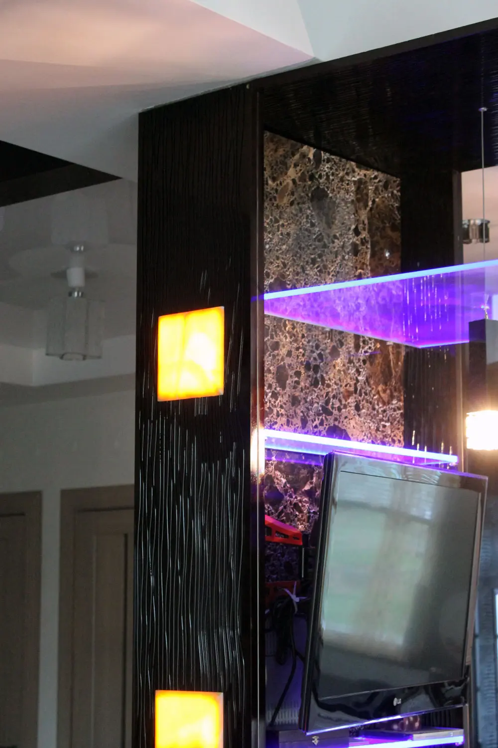 В итоге нашли подешевле и несколько изменили цветовую гамму. Внутренняя отделка и столешница из мрамора "Emperador Dark", полки и козырёк из оптического стекла с подсветкой. В боковые панели врезаны квадраты из оникса и тоже подсвечены.