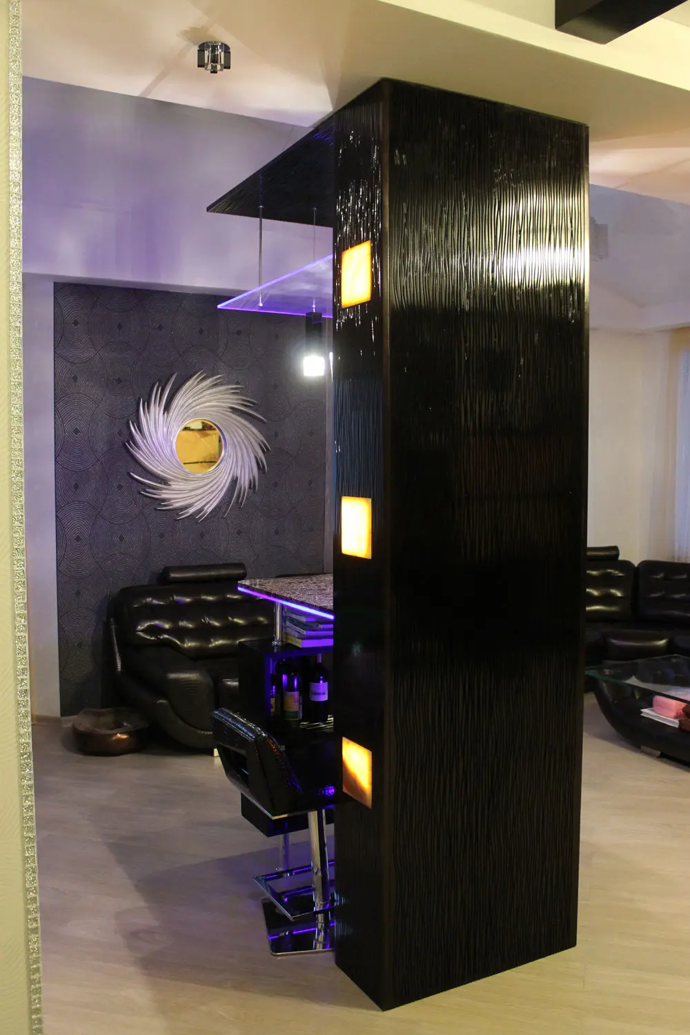 Эта стойка находится в том же коттедже, что и камин. Сначала планировали сделать её из 3D-панелей, но их стоимость даже заказчику показалась чрезмерной.