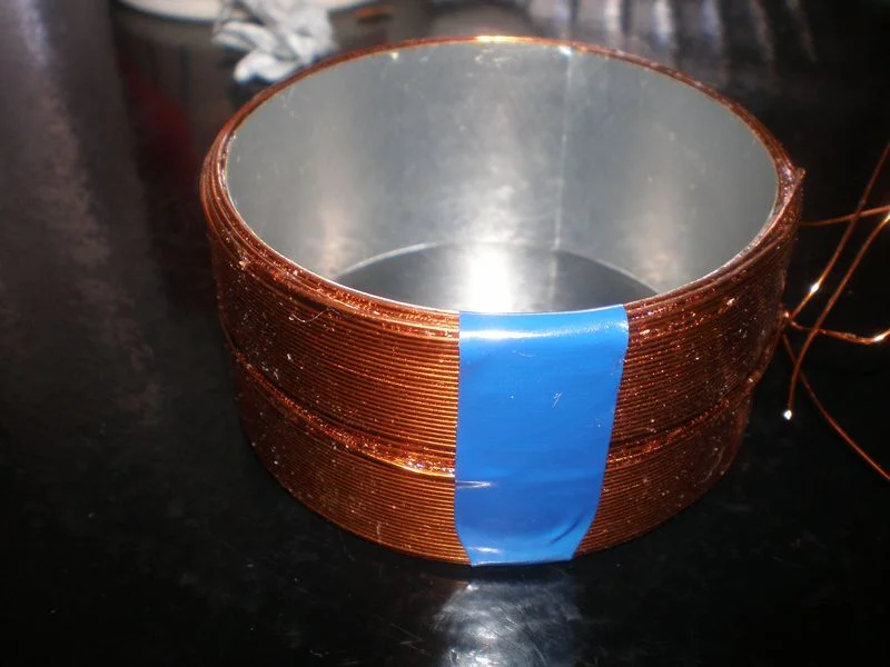 В общем пошел по уже накатанной схеме, вырезал из пивной банки алюминиевый каркас для обмоток обернул этой алюминькой магнит с шайбами (предворительно сделал между магнитом и обмоткой прокладку - ну чтобы потом магнит ходил внутри и не терся об стены. Боковинками послужили те самые мембраны выпиливая которые расхренячил себе руку :D (простите что поэтапно не снимал, все делалось между делом в свободные минуты - было не до фотика)