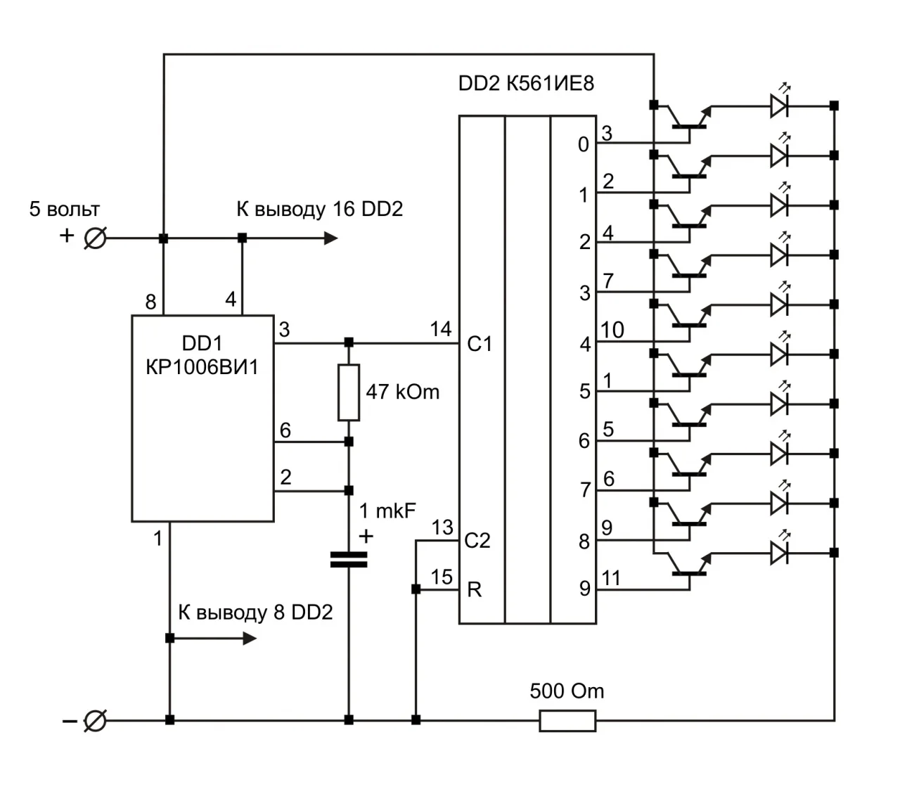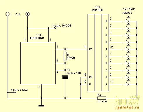 С выхода 3 DD1 импульсы поступают на вход десятичного счетчика DD2, в роли которого выступает К561ИЕ8. С каждым импульсом, счетчик увеличивает свое состояние на 1 и переключает соответствующие выходы. Ну а светодиодам ничего не остается делать, как только включаться и выключаться в зависимости от состояния того или иного выхода.