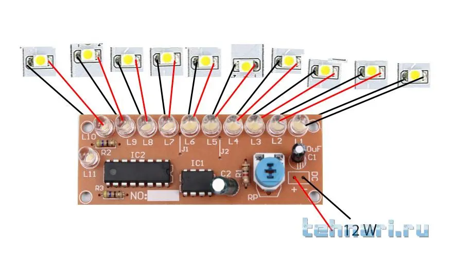 Тебе нарисовали. Это на питание платы. А такие светодиоды она точно не потянет. Прости, не люблю рисовать, и надо даташит на микросхему.что куда паять