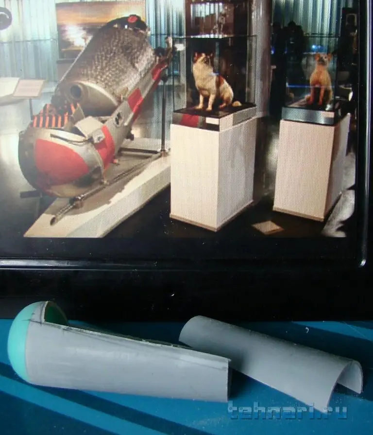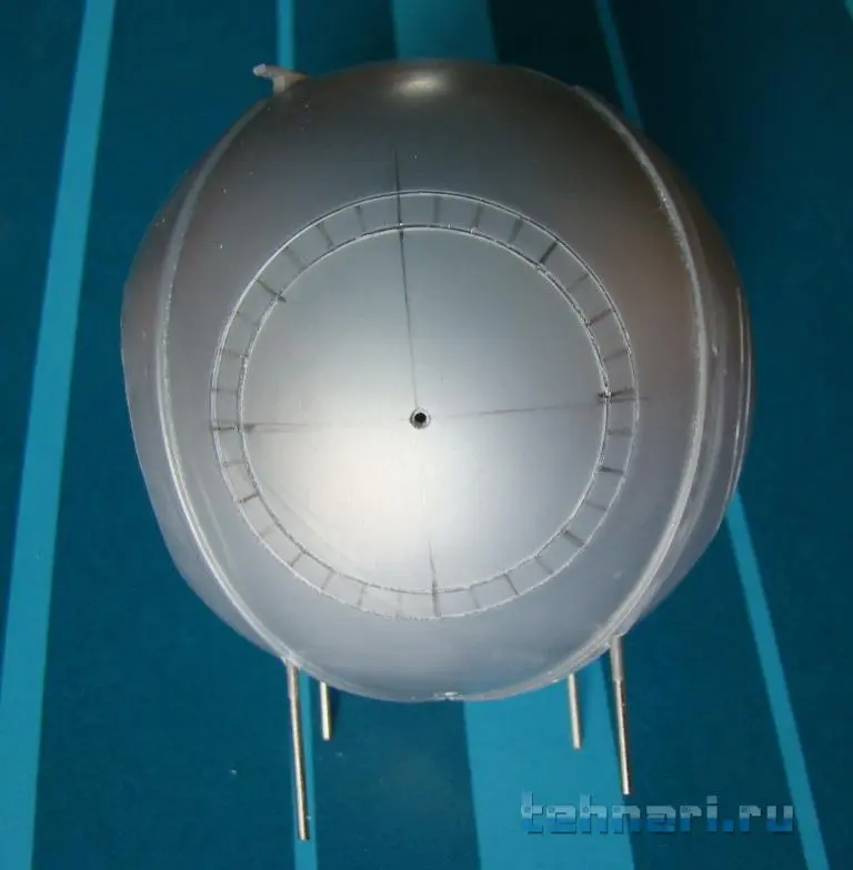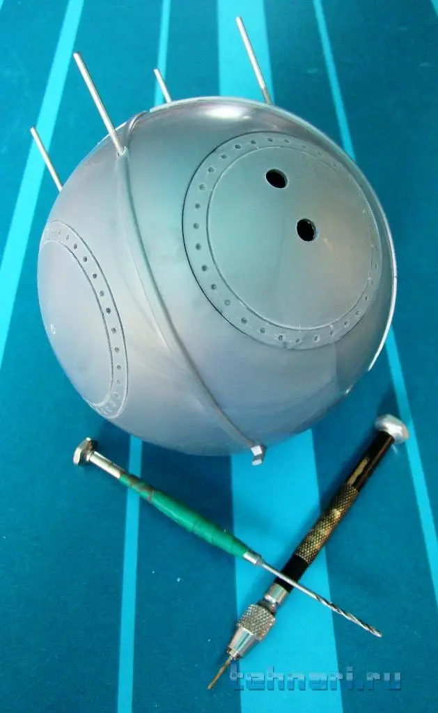 После склейки шара СА вклеиваю в него оголовки антенн, применив для этого инъекционные иглы Ф 2мм. Для пущей надежности изнутри шара места крепления игл вокруг головок обмазаны "Эпоксилином". После полимеризации "Эпоксилина" иглы будут обрезаны в чертежный размер. Следующий этап - прорезка линий расшивки люков, заклейка не нужных в данной модификации корабля иллюминаторов, разметка, сверление и зенковка отверстий для крепежа люков.