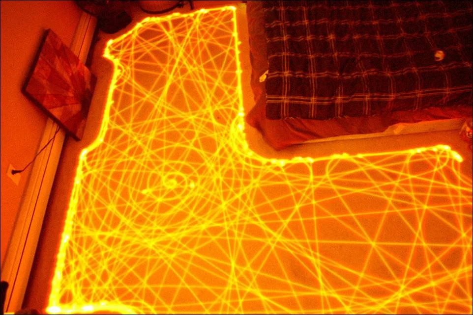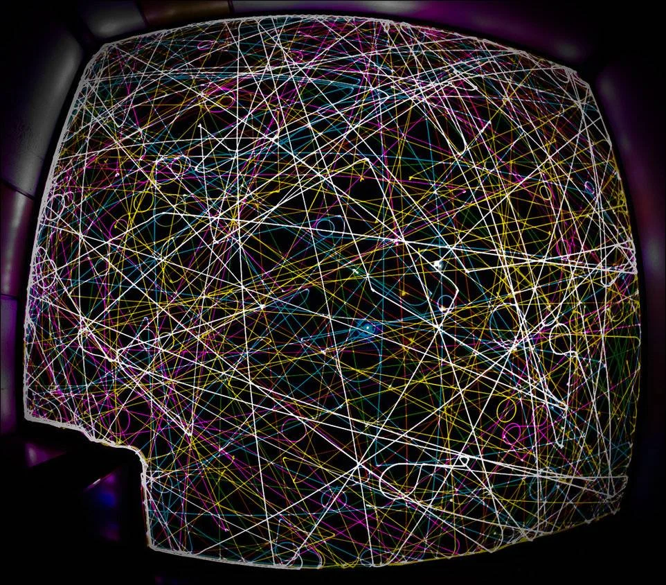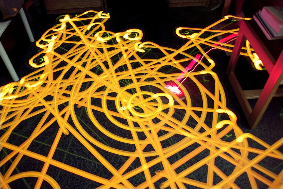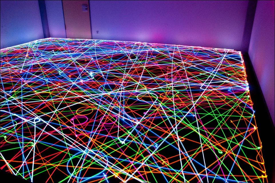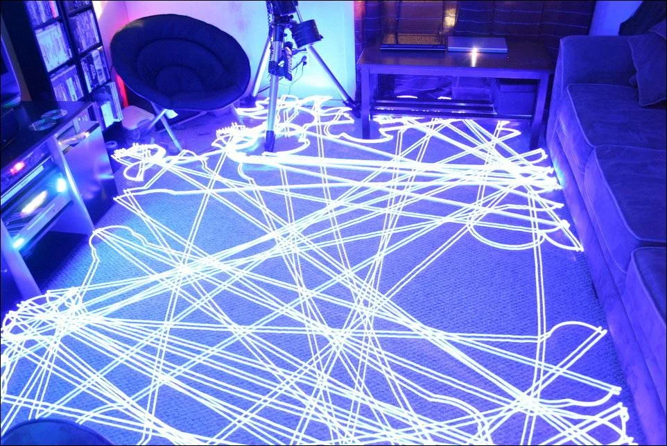 Фотограф прикрепил цветные светодиоды на верхнюю часть автономного робота-пылесоса и использовал длительную выдержку при фотосъемке. Получились вот такие цветные узоры — траектория движения пылесоса.