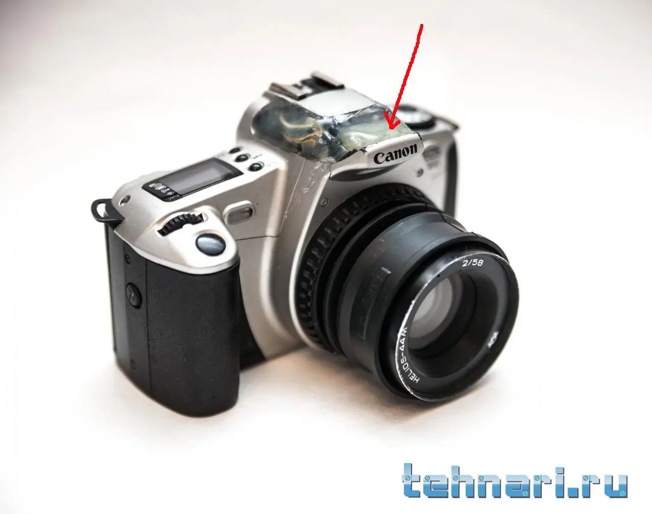 Это найденный мной фотоаппарат, пленочный канон д30. У него была разбита вспышка, и после того, как меня дернуло током, я решил проблему кардинально. :) Кстати, его объектив(30-90, тоже битый корпус) скорее всего пойдет донором для второго тилт-шифта.