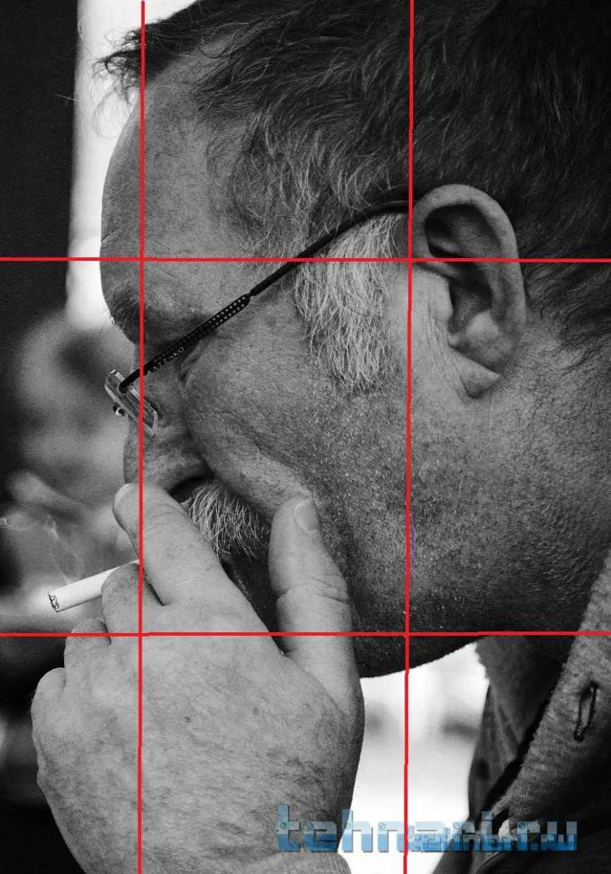 Не так уж что бы и по третям:), но это ладно, а то что обрезано все что можно и нельзя, не видно глаз, рука выглядит очень большой и обрезана по суставу, взгляд упирается прямо в край кадра.