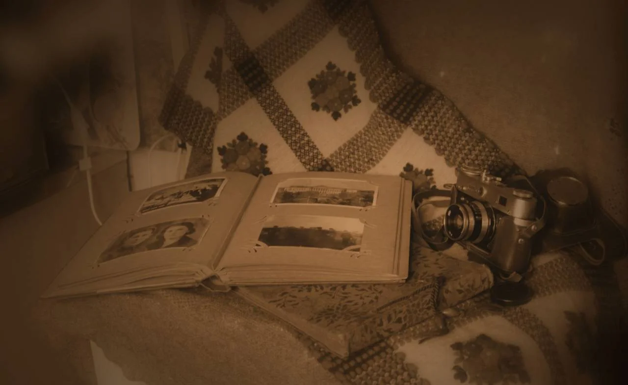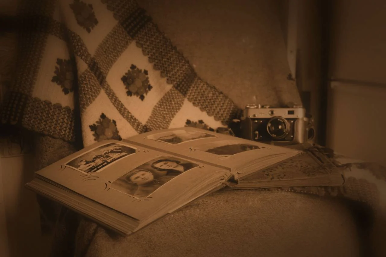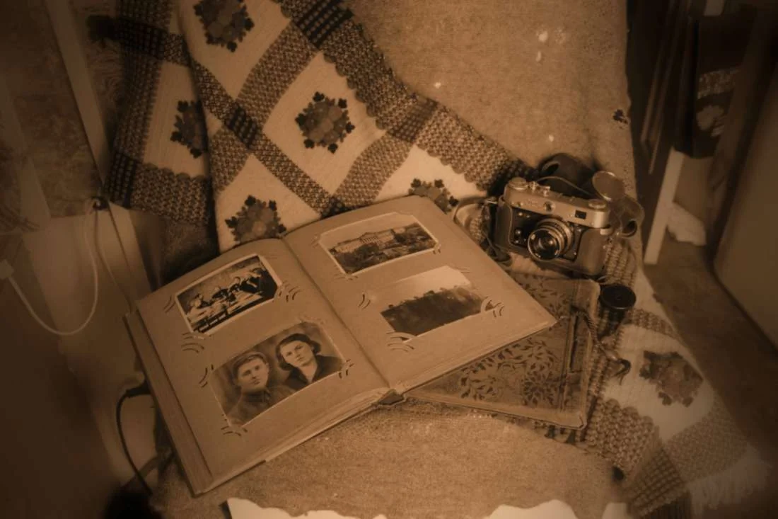 Да? А что? Я вижу покрывало, на нем лежит альбом и старый фотоаппарат. Сбоку какие-то белые проводки видны... Они, я так понимаю, не задумывались автором фото как элемент натюрморта. Ну то ладно.