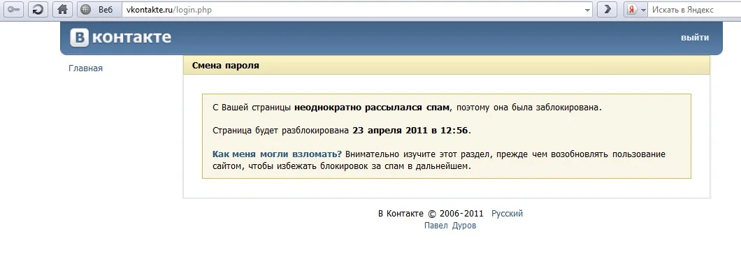 дабы вычислить это- "мои настройки"-> "общее"-> "безопасность моей страницы". смотри, что к чему, когда тебя разблокируют.