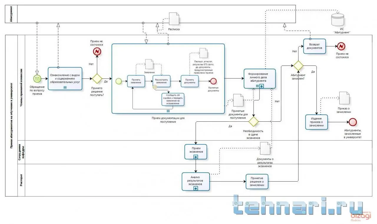 Доброго времени суток. Есть задание нарисовать процесс "прием абитуриентов в вуз" в bpmn - модель "как есть" и "как должно быть". А также определить метрики и точки контроля. Процесс "как есть" - сделан, прилагаю к заданию. Хотелось бы узнать адекватно ли построена модель???