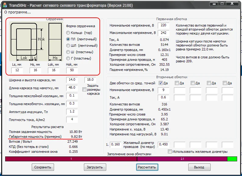 У этого трансформатора 25...27 витков на вольт, для 9В надо 225...243витка