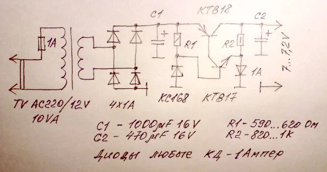 какой мощности нужно брать транс? и какой стабилизатор лучше использовать ? чтобы добиться 7,2 вольта