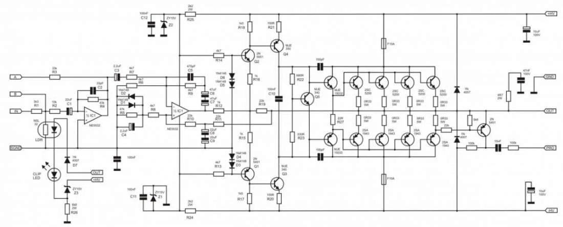 Питание двуполярное от 55 до 90 вольт в плечо.