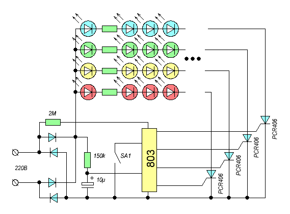 На выходе стоят 4 тиристора PCR406J. А если в место тиристоров поставить транзисторы получится что нибудь?Если на выходе стоят тиристоры, то, скорее всего, плавное включение светодиодов или лампочек при питании постоянным током получить не удастся. Тиристорные ключи подразумевают фазовое управление для получения изменения яркости, что при постоянном токе невозможно.
