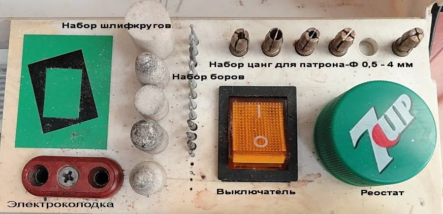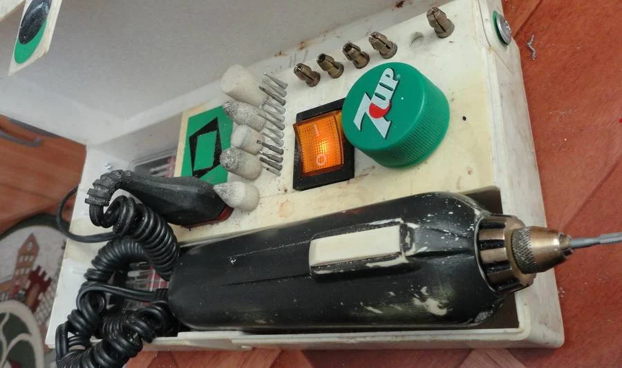 Продолжение по теме. Для размещения блока питания, самой минидрели, сопутствующих принадлежностей и проводов подобрал бокс от какого-то списанного измерительного прибора. Спрятал в нем трансформатор, выпрямитель, реостат, на крышке блока питания разместил гнезда для хранения цанг, набора шлифкругов, зубопротезных боров. Получилось довольно компактно и приятно в руках подержать, не говоря уж о работе (сверление,фрезерование,шлифование,полирование, отрезка, гравирование), при которой использую многие новинки обрабатывающего инструмента, в том числе и от DREMEL. А оборотов и мощности вполне хватает для стендового моделизма, поскольку пластик это такая вещь , которая не любит очень больших скоростей. Пробовал и гравировать -получилось, здесь многое зависит от инструмента и конфигурации фрезы.