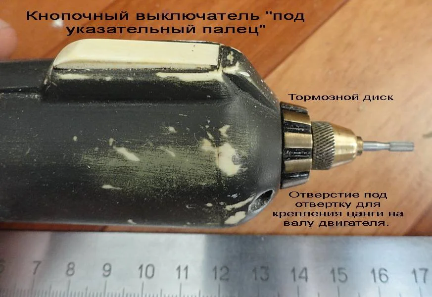 Попробовал работать на разных режимах и с разными насадками - если наружный диаметр насадки не превышает 25 мм (полировальный круг, отрезной круг), то мощности двигателя хватает, а обороты можно регулировать реостатом, правда при этом теряется момент на валу, что в общем-то при приобретении навыков выбора режимов обработки и не замечаешь(уже 20 лет).Все можно было бы оставить и так, сложить схему в коробку, вытянуть из нее провода до сети и электродвигателя и работать- видал я такие самоделки в магазинах. Захотелось большего - чтобы держать предмет в руках и чувствовать, что "вещь имеешь".Прорисовал внешний облик минидрели, нарезал из листового пластика толщиной 2мм заготовок и обложил ими электродвигатель, предварительно смазывая полистирольным клеем сопрягаемые поверхности. После этого стянул всю сборку "резиновой лапшой" и дал просохнуть.Обработал торцы сборки, наклеил переднюю и заднюю крышки, при этом предварительно выполнив в них отверстия под выход вала электродвигателя и тормозного диска на передней крышке и под выход колодки электроразема гибкого шнура. Вилку разъема предварительно вклеил в заднюю крышку, включив в электросхему, находящуюся внутри корпуса (электродвигатель, вилка электроразъема, микровыключатель). Затем произвел черновую и чистовую обдирку склееного корпуса до степени похожести на то, что я нарисовал.Когда контуры изделия прояснились, в верхней его части, под указательным пальцем , установил кнопочный микровыключатель и закрыл его плоской панелькой. Затем последовала окончательная обработка корпуса шкуркой, полировка, покраска.Для установки цангового патрона на валу сбоку в корпусе просверлил отверстие под жало отвертки.Для удобства пользования при смене насадок выточил тормозной диск, одеваемый на корпус цанги и прижимаемый накидной гайкой. В качестве вилки электроразъема использовал корпус блока выключателя от старой элюбритвы "Агидель". От нее же - и гибкий витой шнур.