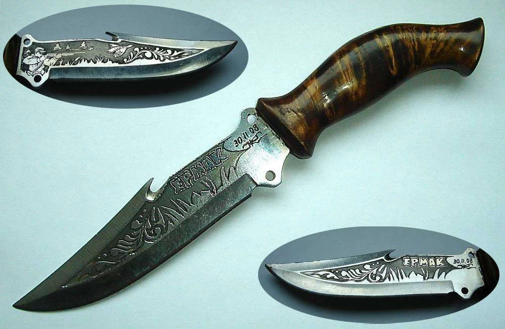 здравствуйте, уважаемые форумчане! хочу вытравить на ноже узор. имеется трансформатор ТСА 70-6 (ТТХ представлены ниже), хочу посоветоваться, какими вторичными обмотками воспользоваться для этой цели. для травления вроде чем больше ток - тем лучше, но как с напряжением? я рассматривал 2 вторички 7-7' (6,5В, 1,15А) и 9-9' (28,5В, 0,8А). на первой ток нормальный, но меня смущает напряжение. ниже выкладываю фотки транса и для наглядного примера вытравленые изделия.