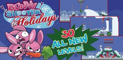 Bunny Shooter Christmas Free - продолжение веселой аркады про кроликов и охотников. Добавлено 30 новых уровней, слегка переделан интерфейс, но смысл игры остался прежним - натяни тетиву лука и выстрели в кроликов. Задача попасть во всех кроликов, указанным количеством стрел.