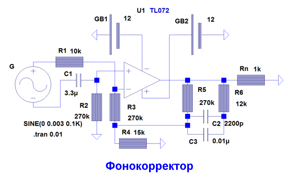 Не всё так просто в этом мире. ММ-головки обычно выдают сигнал в районе 3...7 мВ на частоте 1 кГц. Но на других частотах уровень сигнала меняется, на низких уходит вниз более чем на порядок, на высоких вверх, и тоже более чем на порядок. Чтоб не думать обо всей этой фигне при составлении схемы и исследовании её работы в симуляторе, сигнал на вход корректора удобно подавать через AntiRIAA-фильтр.