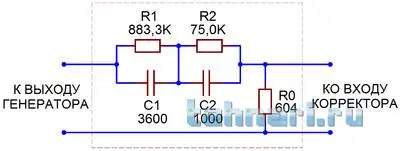 Этот фильтр формирует на входе корректора требуемое изменение уровня сигнала в зависимости от частоты. Нужно только вначале на генераторе установить частоту 1 кГц и подобрать такой уровень выходного сигнала генератора, чтоб на входе корректора было около 5 мВ. В дальнейших испытаниях меняем только частоту генератора без изменения уровня выходного сигнала.