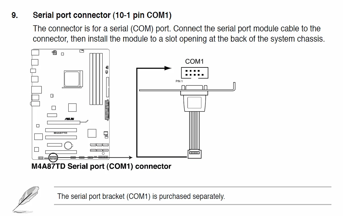 Добрый день помогите с этой планкой COM порт есть, нужно спаять такую планку но как разобраться с распиновкой на самой мамке на написано в User Guide тоже ничего. Можно и купить но дорого, а самому спаять делов на 10 минут тем более что все есть под рукой только распиновки нет :( Материнка m4a87td