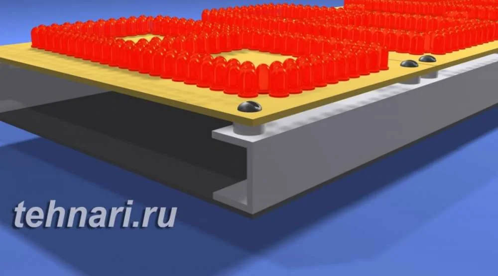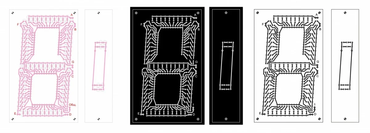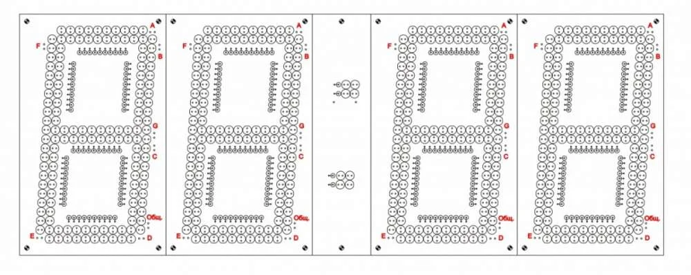 Светодиоды располагаются в два ряда и соединяются попарно. Если применить светодиоды красного цвета, то диоды можно объединить по четыре в цепочке, что позволит снизить потребление тока. Балластные резисторы надо будет подобрать в зависимости от применяемых светодиодов. К примеру для зелёных или синих светодиодов понадобятся резисторы по 150 Ом. Ввиду большого размера табло, печатные платы надо делать отдельно для каждого знака и ещё одну для разделяющего двоеточия. После изготовления платы распаиваются согласно схеме, сегменты помечены латинскими буквами и соединяются параллельно.