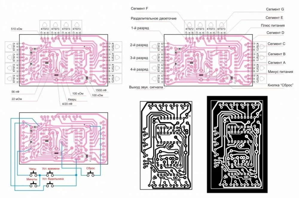 Тут изображена сама плата с расположением элементов, подключением кнопок и трафареты для её изготовления. Трафареты даны в двух вариантах: для ЛУТ и плёночного фоторезиста.