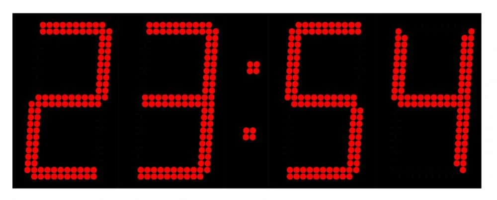 Индикатор часов набирается из светодиодов диаметром 5 миллиметров и имеет размер 440 Х 165 миллиметров. Если применить светодиоды диаметром 10 миллиметров, то табло можно будет увеличить в два раза. Табло имеет вот такой внешний вид.