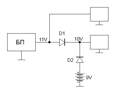 Сейчас нашла старые часы, которые, кстати, ещё и сейчас идут, я там вместо кроны поставила конденсатор большой ёмкости и, тем самым, избавилась от лишнего диода. Вот в них я просто поставила диод в разрыв питания самих микросхем, а конденсатор просто параллельно этому питанию. И как я уже говорила, мне тех нескольких часов, которые держит этот конденсатор, вполне хватало. Изредка, когда свет пропадал надолго, сутки и более, приходилось настраивать время.