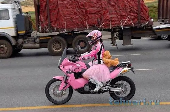 Мотоцикла к сожалению нет, она у нас ярый автолюбитель. Хотя было бы интересно :))